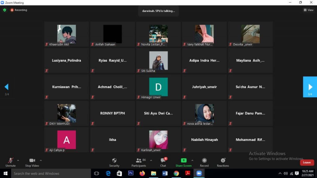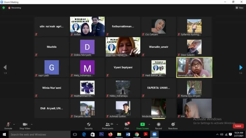 Himpunan Mahasiswa Agribisnis (HIMAGRI) Fakultas Pertanian Universitas Wiralodra menyelenggarakan webinar bertema “Agroprenuer Membangun Generasi Milenial yang Tangguh". Kegiatan tersebut berlangsung pada hari Sabtu, 27 Februari 2021 pukul 09.00-11.20 . Acara dimulai dengan dibuka oleh MC yaitu Ibu Arsy Nur Fadilah, S.P., M.Sc. selaku Dosen Fakultas Pertanian Universitas Wiralodra. Kemudian dilanjutkan keacara inti yang disampaikan oleh Ibu Darwinah, S.Ag. yang merupakan wirausahawan sukses, Owner Kenanga Mandiri dan sekaligus alumni FKIP UNWIR.